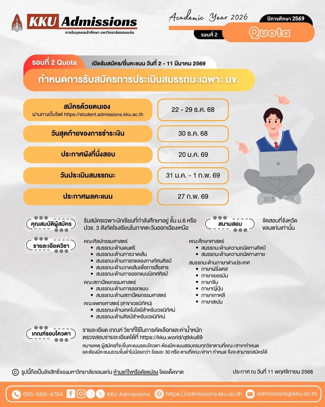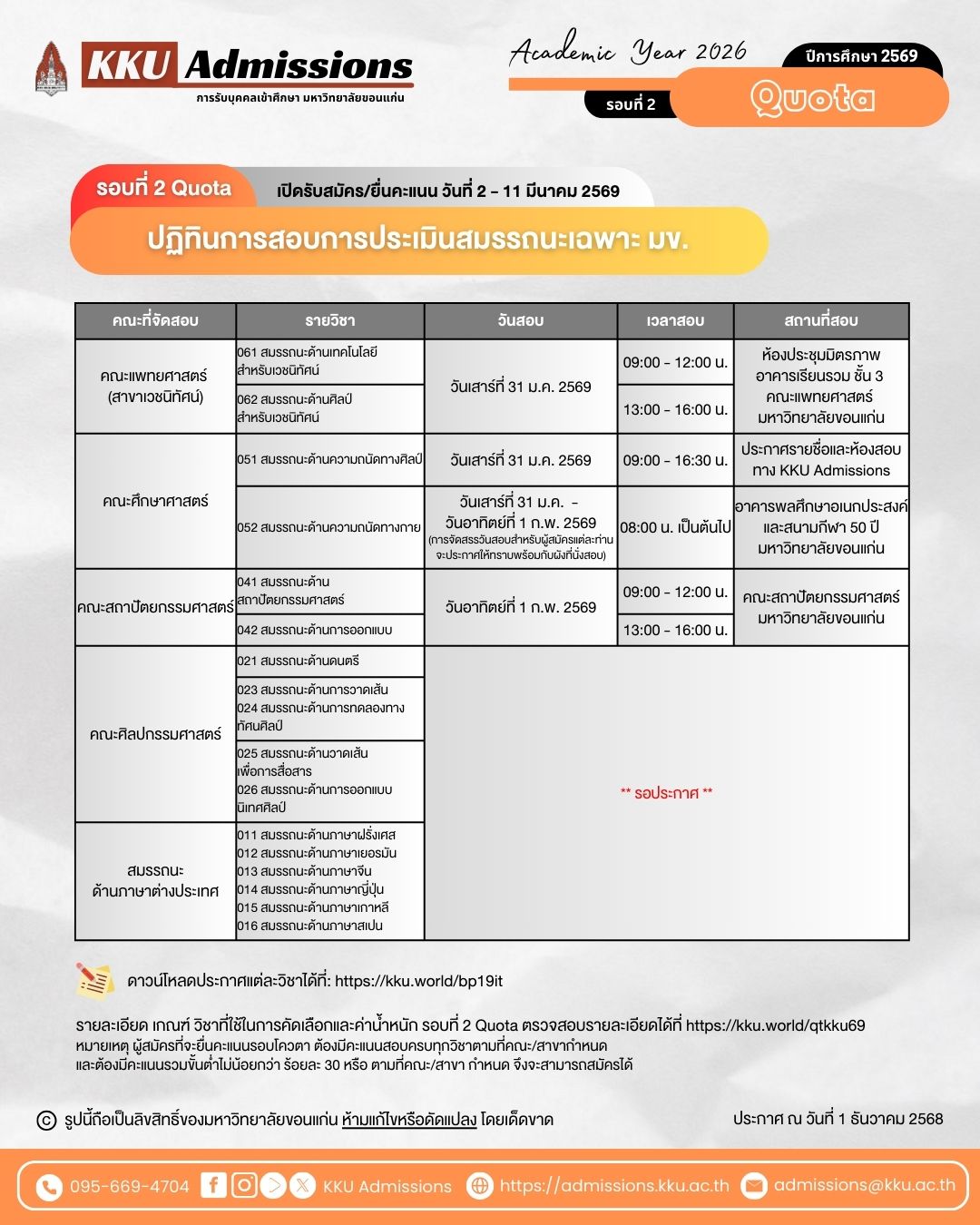 รอบที่ 2 Quota: กำหนดการรับสมัครการประเมินสมรรถนะเฉพาะ มข. ประจำปีการศึกษา 2569