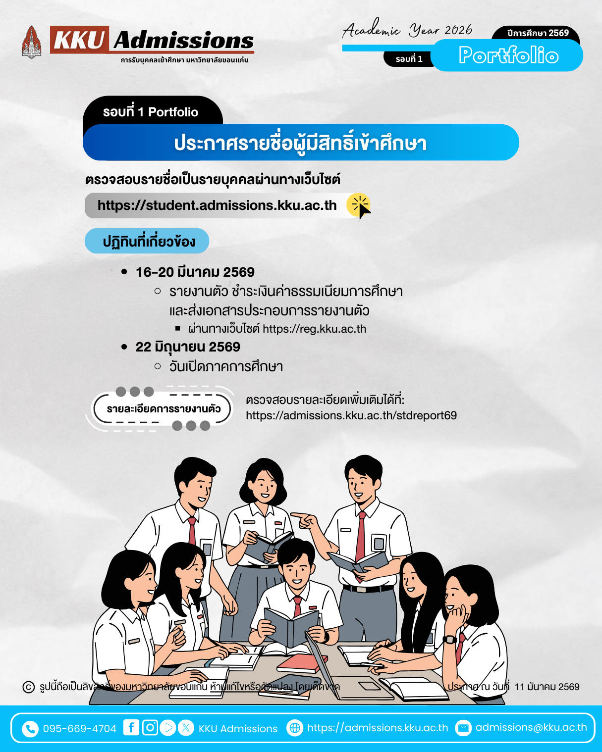 ตรวจสอบรายละเอียดการรายงานตัว ได้ที่: https://admissions.kku.ac.th/stdreport69